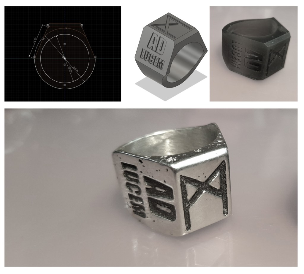 Réalisation d’une chevalière . CAD / Print 3D / Moulage silicone / Coulage étain .